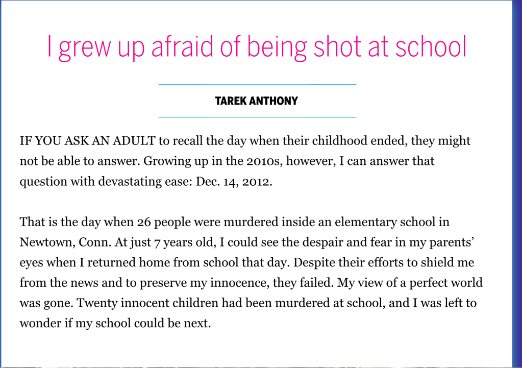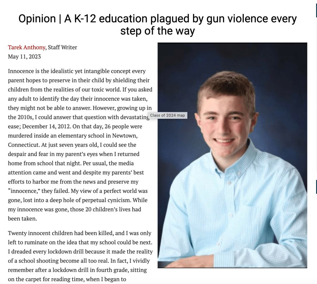 In September 2023, Tarek’s high school senior column, addressing the impact of growing up surrounded by gun violence, was published in the Boston Globe’s “Teens Speak” edition. Although this was Tarek’s only opinion article to date, it exemplifies his aspiration to leverage journalism for positive change in the world.